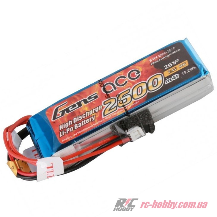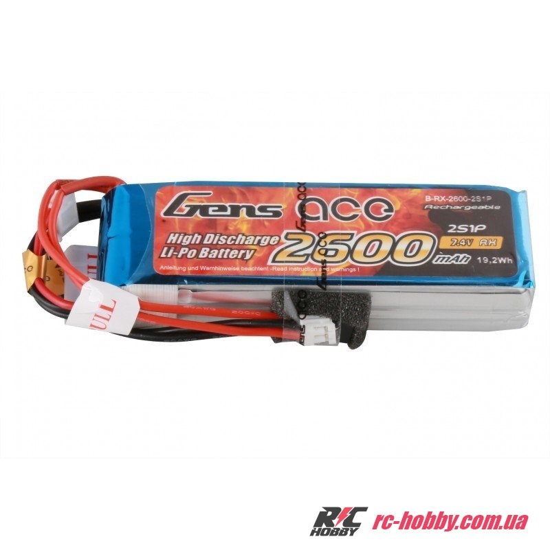 Аккумулятор Gens Ace LiPO 7,4 В 2600 мАч 1C 2S (B-RX-2600-2S1P) разработан для применения в аппаратурах радиоуправления Sanwa MT4, Sanwa M11x, Sanwa M12, Futaba T6J, T8FG, 12FG,TARANIS X9D 2019 PLUS.