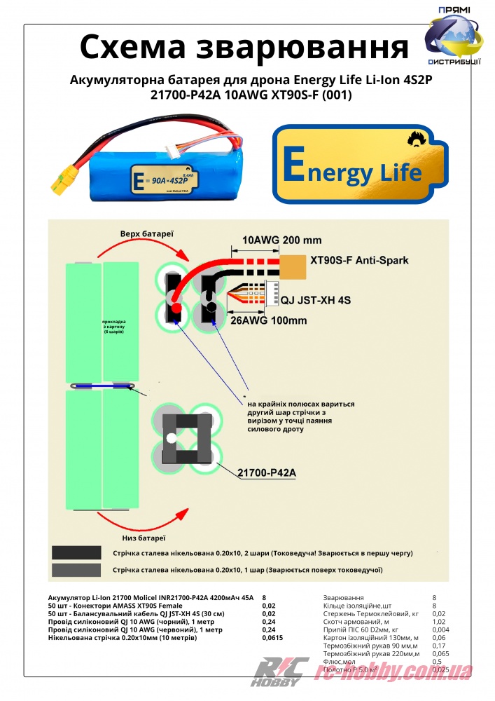 Технічні характеристики Акумулятор 4S2P Energy Life 8400 мАч Moliсel 21700-P42A Li-Ion 10AWG XT90S-F (001)