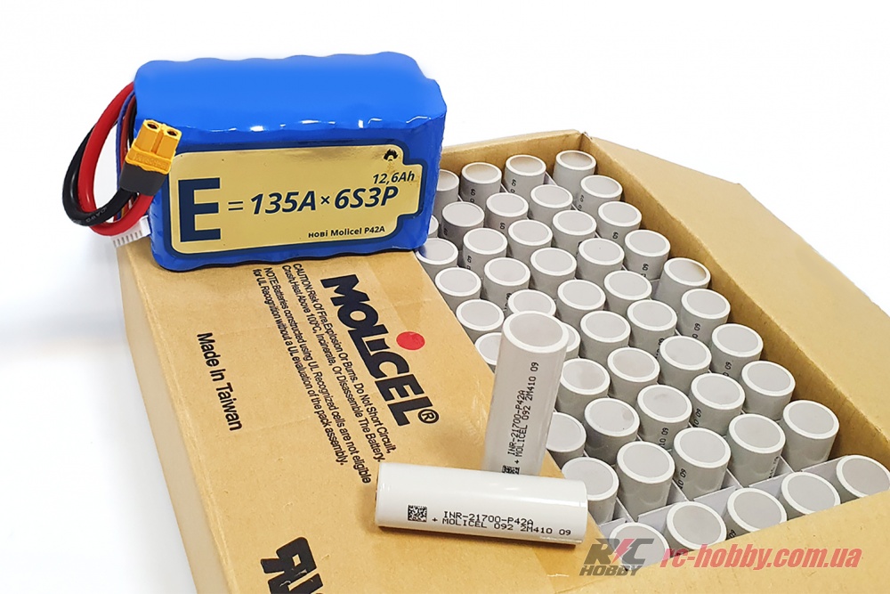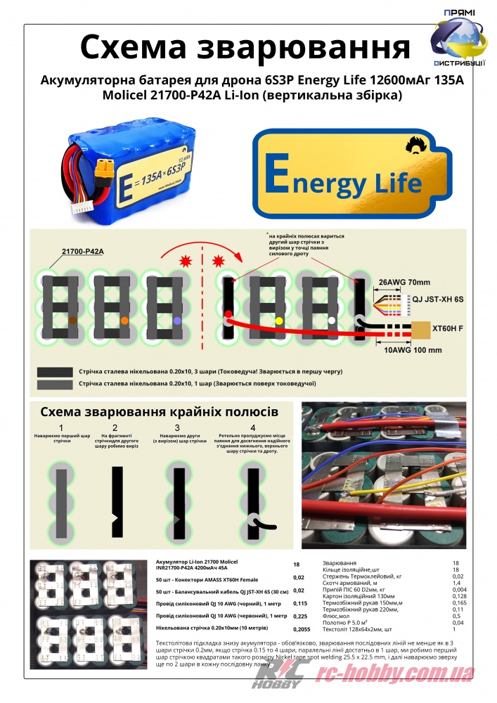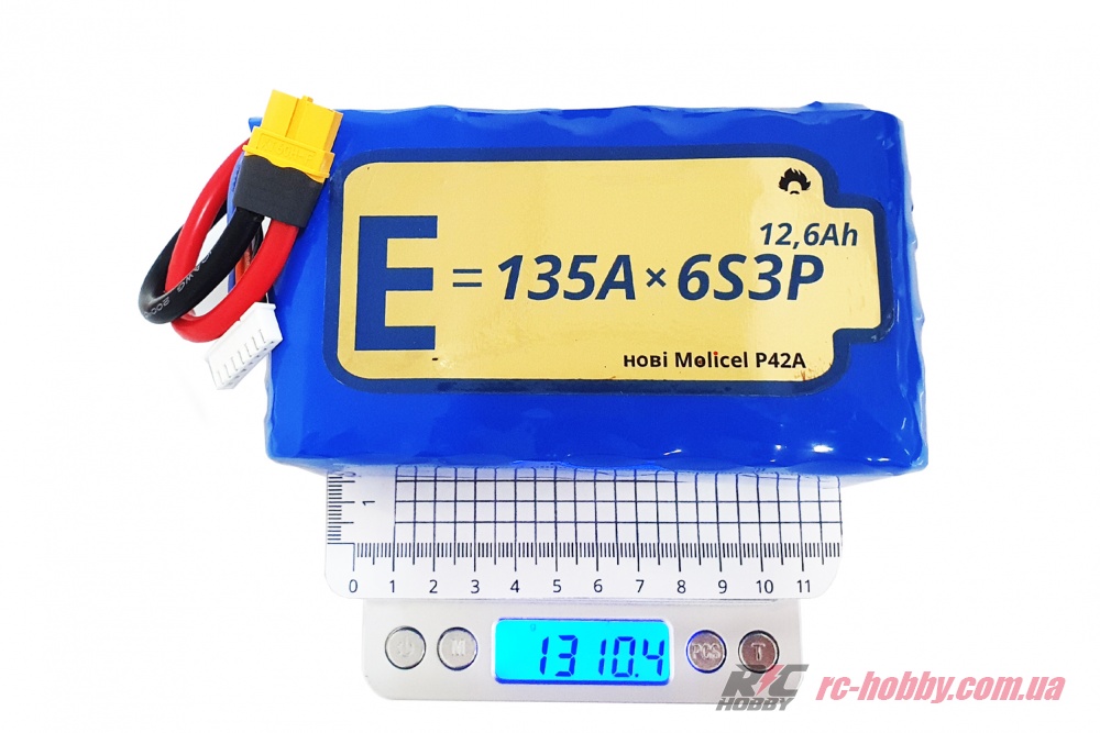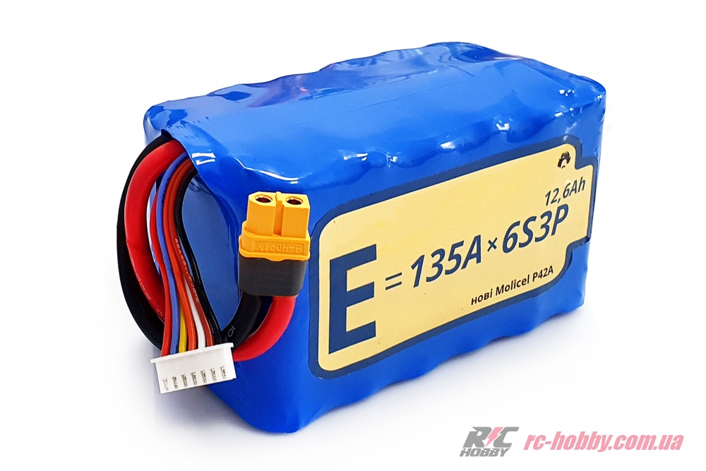Акумуляторна батарея для дрона 6S3P Energy Life 12600 мАг 135 А - вертикальна акумуляторна збірка з оригінальних нових Li-Ion елементів Moliсel 21700-P42A, дроти 10 AWG, конектор Аmass XT60-Female. Силова батарея для дрону збирається з оригінальних і винятково нових акумуляторів 21700 Моliсel P42A 4000-4200 мАг, 3.6 В, піковий струм – 45 А, тривалий.