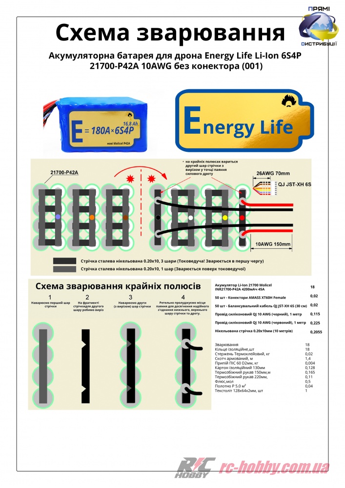 Технічні характеристики Батарея Energy Life Li-Ion 6S4P 21700-P42A 10AWG без конектора (001)