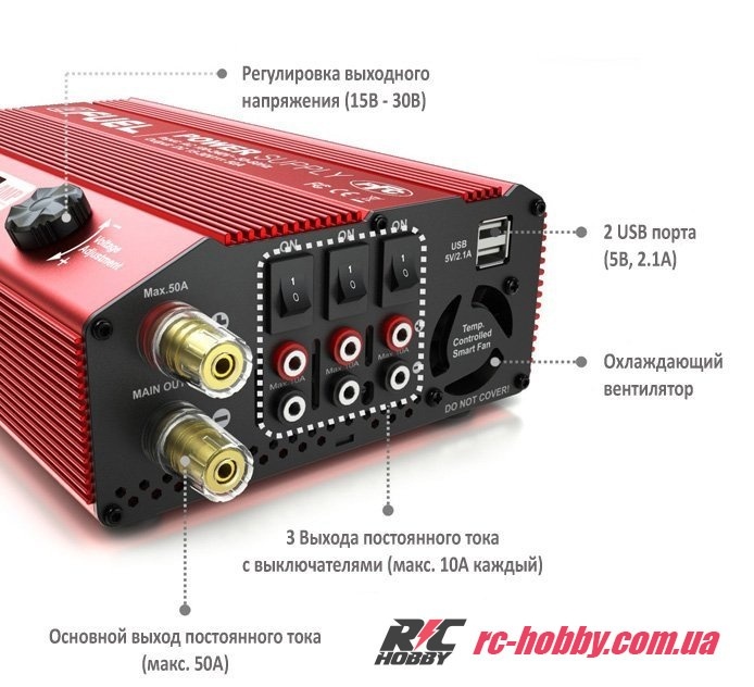 Блок живлення SkyRC eFuel забезпечений одразу чотирма роздільними виходами для підключення до чотирьох зарядних пристроїв одночасно. Один - основний, з навантаженням до 50A, і три - регульовані (обладнані окремими кнопками включення), до 10A кожен. Додатковою зручністю є наявність двох потужних USB-портів для заряджання USB-пристроїв струмом до 2,1А.