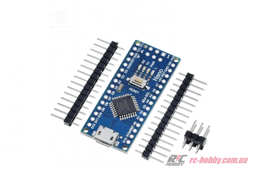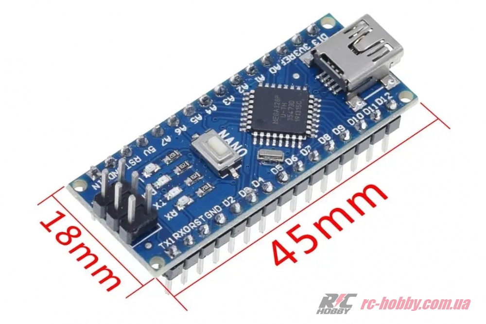 Arduino Nano V3.0 – маленькая, самодостаточная, разъемо-совместимая с макетками плата на микроконтроллере ATmega328. Она более-менее совпадает по функциональности с Arduino Duemilanove/Uno, но имеет другой форм-фактор. Arduino Nano недостает только разъема питания, а для подключения к ПК применяется Mini-B USB кабель (нет в комплекте).