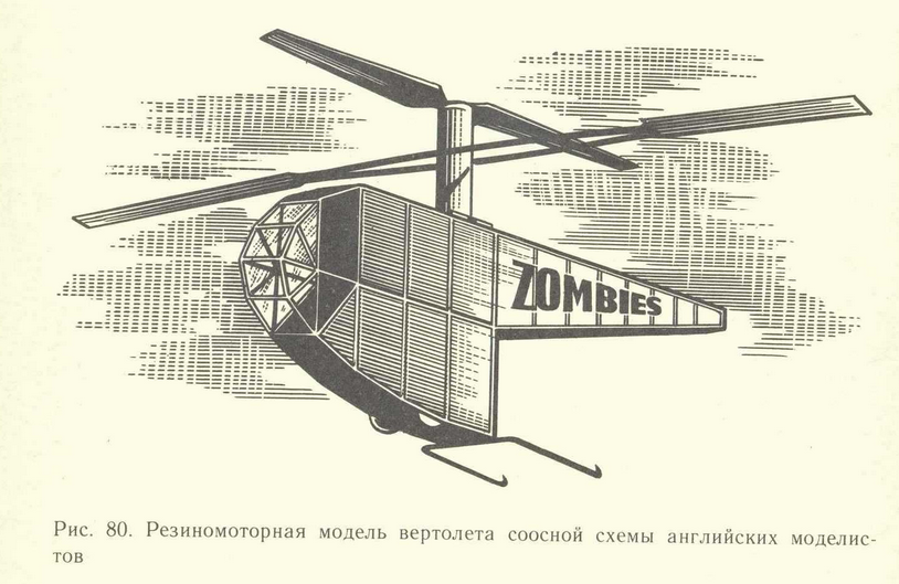 Естественно, что первые спортивные модели вертолетов были резиномоторные. Выполнялись они по соосной схеме, повторяя в разных вариантах модель Б. Лоуна и Ж. Бьенвеню. Особенно популярен был вариант соосной, приложенный и опробованный, как мы уже знаем, А. Пено в 1870 году. Особенность состояла в том, что резиномотор вращал верхний пропеллер, а контрпропеллер наглухо соединился с вращающимся в противоположную сторону фюзеляжем.