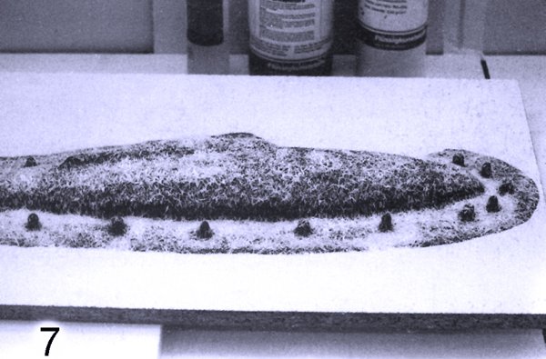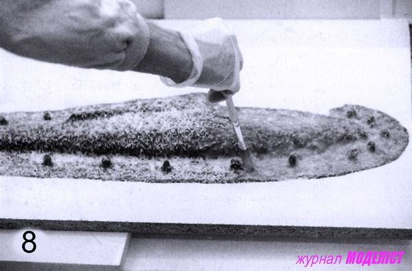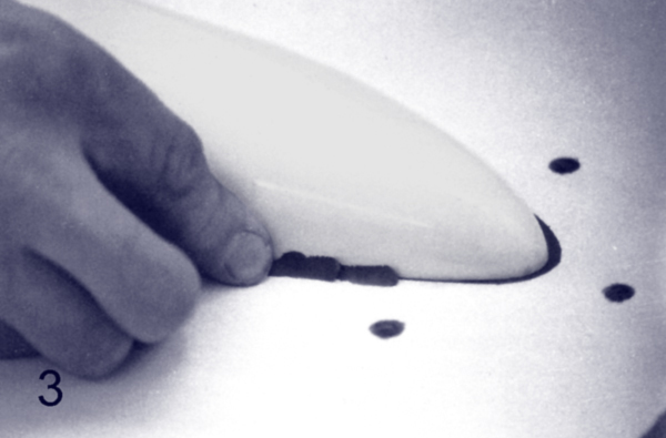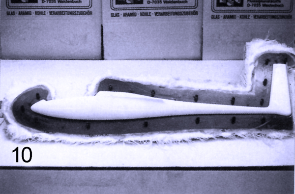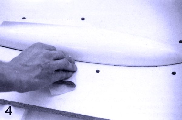 Относительно фиксирования мастер-модели в плите можно назвать несколько способов, среди них фиксация точным шпангоутом снизу, крепление подпорками и другие. Но поскольку в нашем случае имеется фюзеляж планера из пенопласта, а это небольшая и легкая модель, то для ее прикрепления можно смело использовать обычный пластилин. Небольшие куски пластилина подклеиваются снизу плиты по всему периметру фюзеляжа, также прихватывается в нескольких местах сам фюзеляж и выставляется по размеченной осевой линии. И после завершения последующего заклеивания щели по контуру макета на рабочей стороне плиты с использованием небольшой деревянной лопатки и аккуратной зачистки вдавленного пластилина имеем полностью закрепленную мастер-модель.