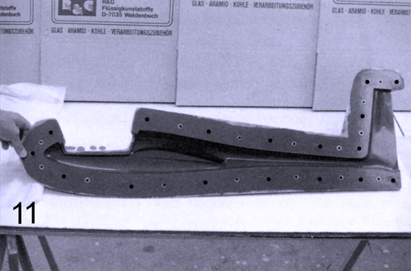 Приступая к открыванию готовой формы (не раньше чем через 24 часа), сначала лучше обрезать остатки ткани на фланце, а потом в линию стыка половинок формы вставить нож и небольшие буковые клинья. Именно так, аккуратным углублением, можно открыть одну половинку. Теперь под стяжные болты (например, М6) надо просверлить насквозь оба фланца, расстояние между отверстиями на них должно становить от 80 до 100 мм.