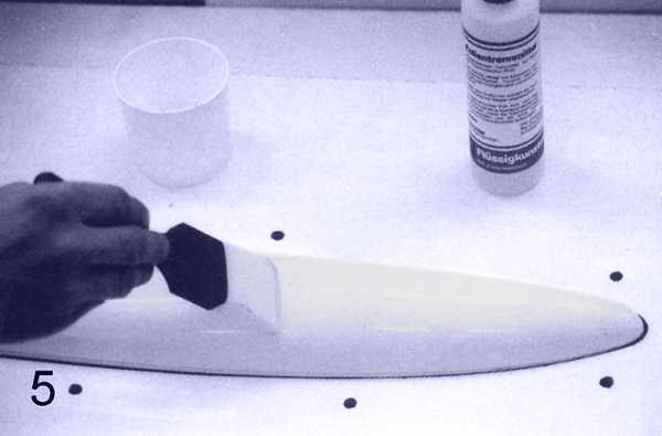 В целях экономии допускается использование более дешевой эпоксидной смолы для ламинирования последующих слоев, но не желательно использовать ее при изготовлении самых важных форм. Фланец формы должен быть достаточно толстым и прочным (при открывании он испытывает большие механические нагрузки), поэтому на него наносят дополнительные слои ткани. Смола затвердеет не раньше чем за 24 часа и только после этого можно начать процесс отделения формы с моделью от плиты. Начинаем из отделения пластилина от модели деревянной лопаткой (важно не касаться самой модели), потом тонким ножом отделяем плиту, слегка поддевая фланец формы. Ножовкой по металлу или лобзиком обрезаем лишний материал на фланце, очищаем от опилков и остатков пластилина. После этого наносим несколько слоев (4-5) разделителя на фланец и один-два слоя на саму модель.