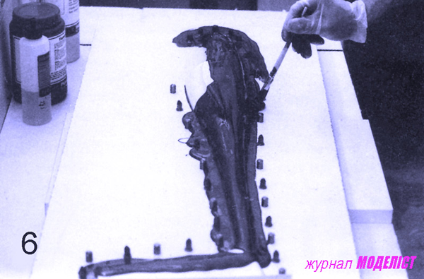 Теперь можно приступать к формовке негативной формы. А поскольку этот процесс требует несколько часов непрерывной работы, то начинать его необходимо из соответственным запасом времени и свежими силами, а если деталь еще и большого размера – то работать рекомендуется вдвоем. Стоит помнить о мерах предосторожности: работать только в защитных перчатках, избегая контакта с кожей рук при работе со смолами; помещение для работы должно хорошо проветриваться. Следующим нашим действием будет нанесение на модель специальной формовочной смолы, функция которой – образование внутренней рабочей поверхности формы.