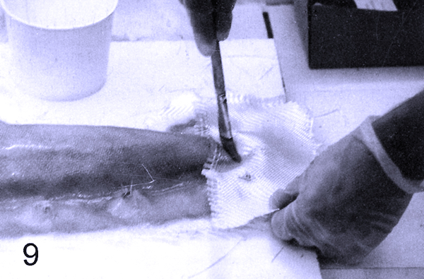 Немного позже (через 2 часа) наносим на макет рабочую эпоксидную смолу, смешанную с хлопковым наполнителем, которая заполнит все неровности на поверхности формы и хорошо пропитает соединительный слой.