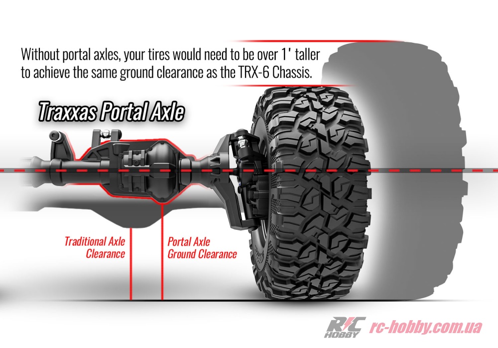 Ексклюзивні портальні осі Traxxas піднімають вантажівку TRX-6 на колеса для величезного кліренсу під осями. Щоб досягти такого самого кліренсу з прямими осями (і не застрягти на бездоріжжі), інші шини повинні бути на дюйм вищі за шини TRX-6.