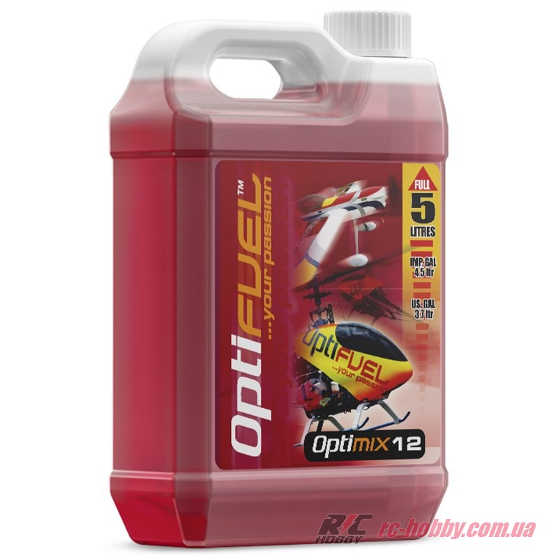 OptiFuel Optimix 12% (OH1218) містить 12% нітрометану та 18% синтетичного масла. Поставляється у повних 5-літрових каністрах, а не в галонах США (3,78 л).