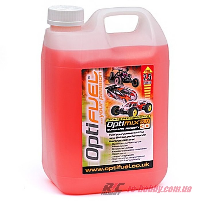Модельне паливо OptiFuel Optimix Race 30% Nitro містить 30% нітрометану та спеціальні оливи та присадки для спортивних двигунів. Постачається у повних 2,5-літрових контейнерах.
