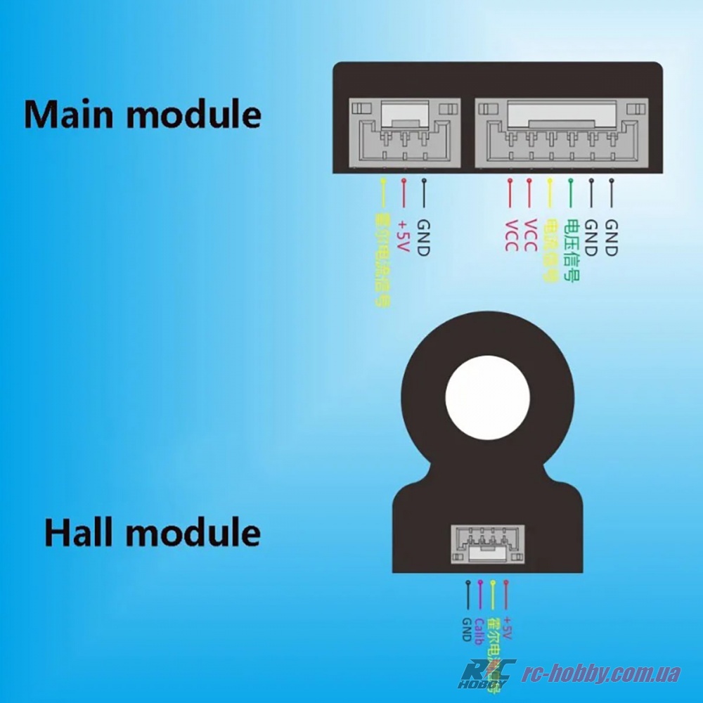Модуль використовує роздільну конструкцію основного модуля (відповідає за живлення та вимірювання напруги) та сенсора Холла (відповідає за вимірювання струму).