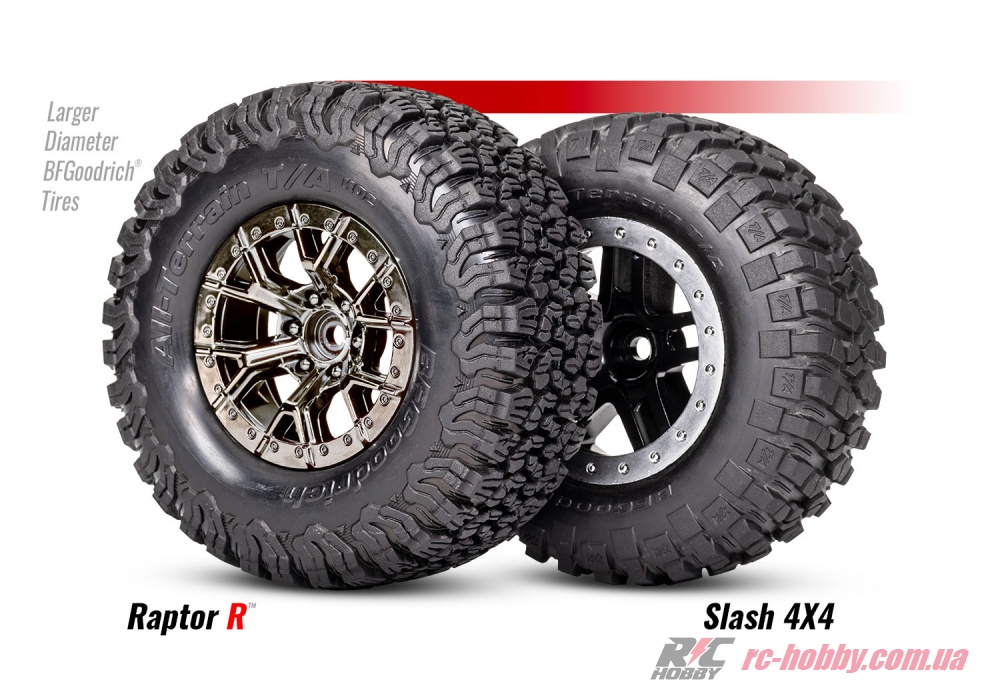 Шестиспицеві диски 2,2/3,0" Split-Spoke Black Chrome із шинами BFGoodrich All-Terrain T/A KO2 4,5"x1,9" гризуть будь-яку поверхню.