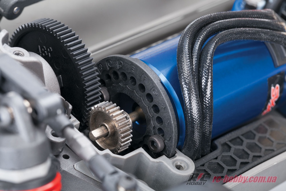Одношвидкісна трансмісія з прямим приводом і передатним числом 6.87 разом із повним приводом 4WD і колісною базою 256 мм забезпечують блискавичне прискорення й залізне зчеплення на асфальті.