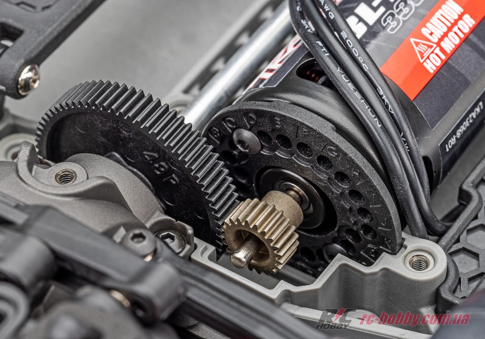 Одношвидкісна трансмісія з прямим приводом і передатним числом 9.49 разом із повним приводом 4WD і колісною базою 256 мм забезпечують блискавичне прискорення й чіпке зчеплення на асфальті.