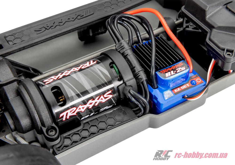 Безколекторний двигун Traxxas BL-2s 3300KV у парі з регулятором BL-2S ESC із повним вологозахистом жене цього красеня до 60 км/год.