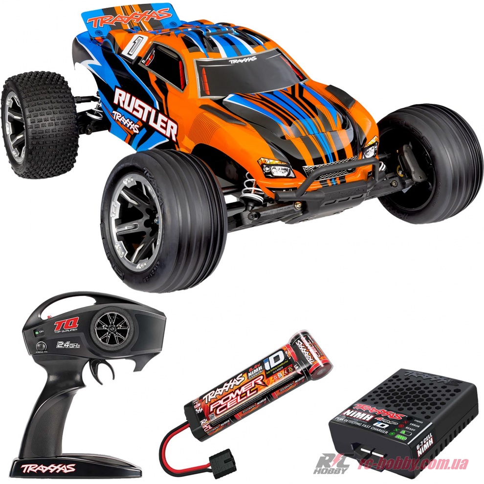 RUSTLER HD поставляється з акумулятором NiMH 8,4В 3000 мАг 7-cell iD і зарядним Traxxas USB-C NiMH iD 4А 45Вт (блок живлення 220В і кабель купуються окремо).