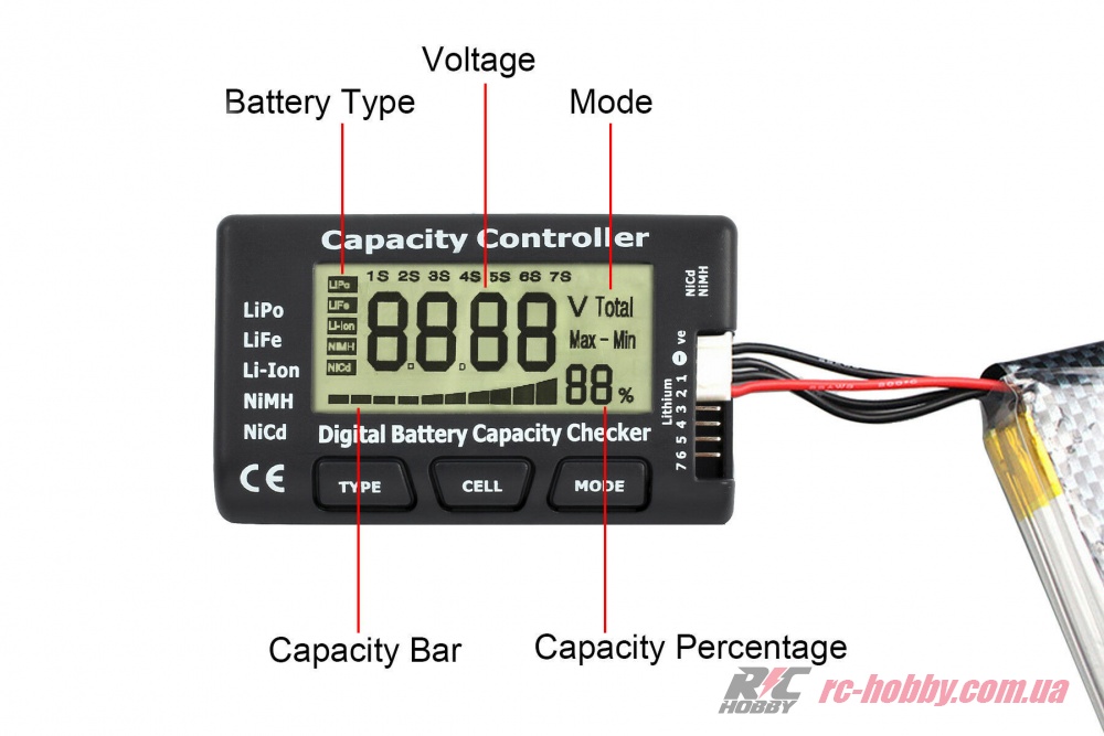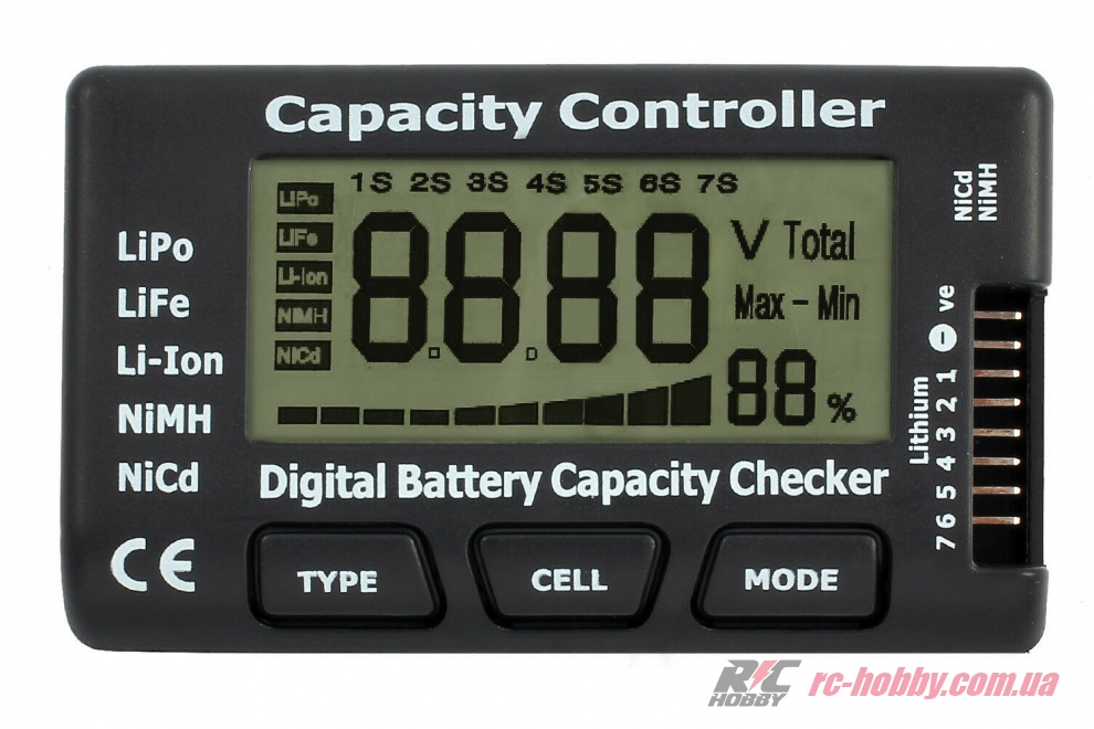 Діапазон ємності: 100 мАг — 20 000 мАг (регульований для LiPo)