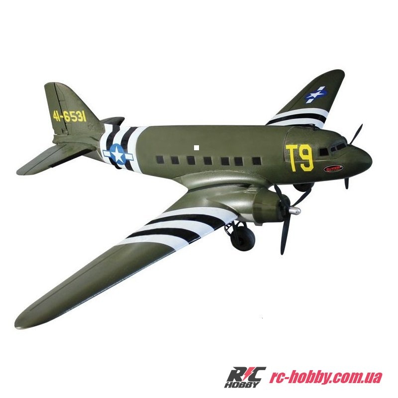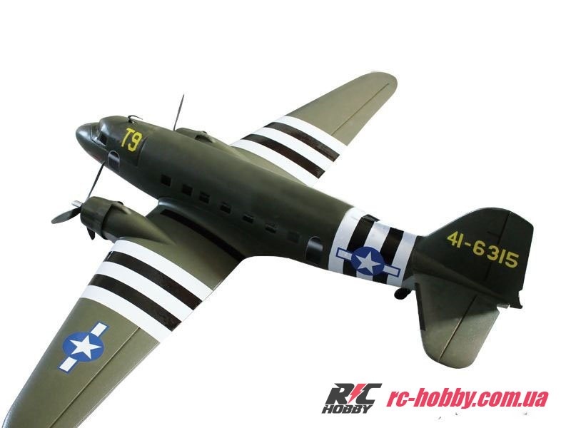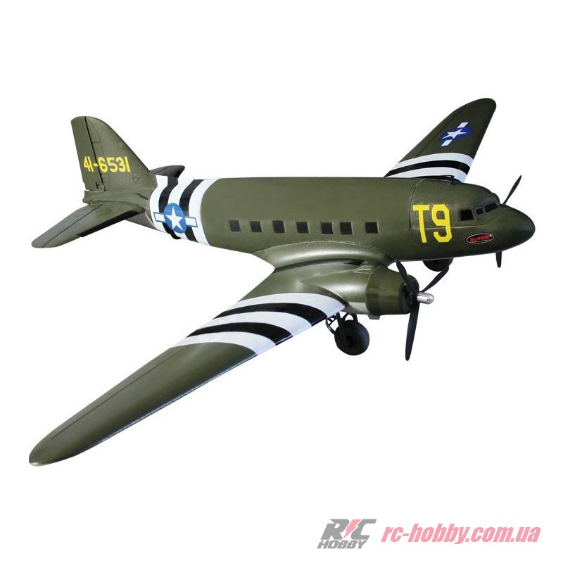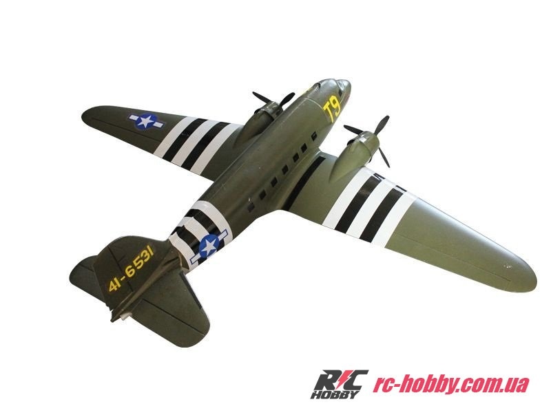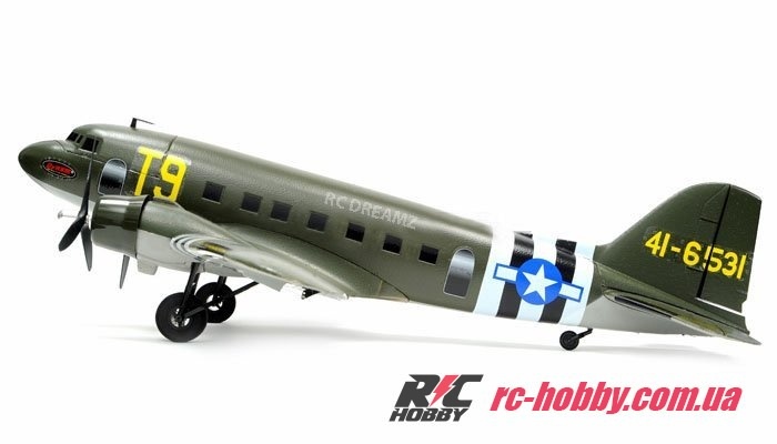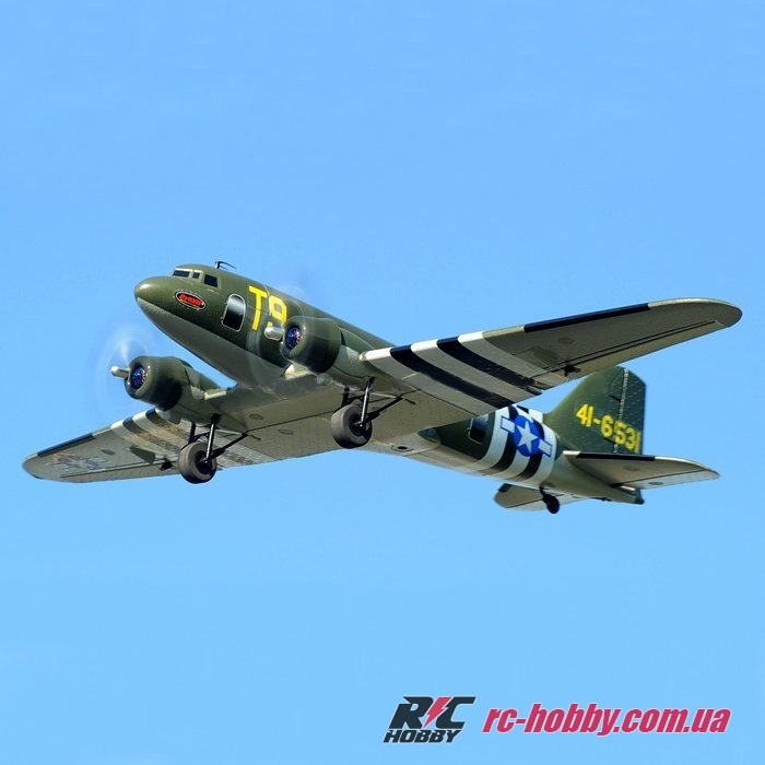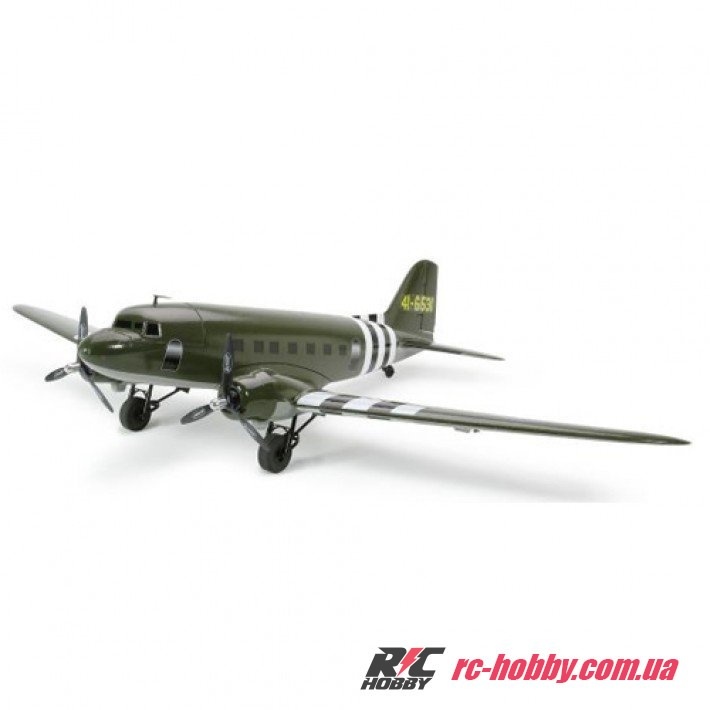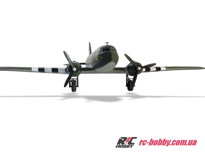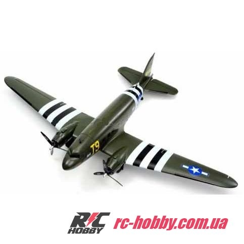 Интернет-магазин RC-Hobby представляет копийную двухмоторную модель американского военно-транспортного самолета времен Второй мировой – Dynam C-47 Skytrain Brushless RTF 1470 мм 2,4 ГГц (DY8931-Green RTF).