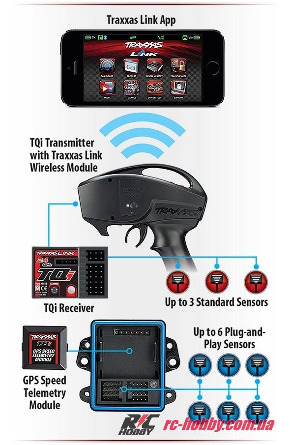 Для повної функціональності потрібен TQi-передавач, модуль Traxxas Link і TQi-приймач у моделі. Датчики телеметрії (наприклад, для температури чи швидкості) продаються окремо.