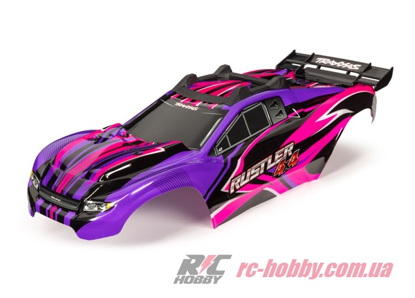 Корпус Traxxas Rustler 4X4, рожево-фіолетовий, наліпка лобового скла, решітка радіатора, аркуш наклейок на фари (у зборі з передніми та задніми кріпленнями для кузова та задньою опорою для кріплення без затискачів).