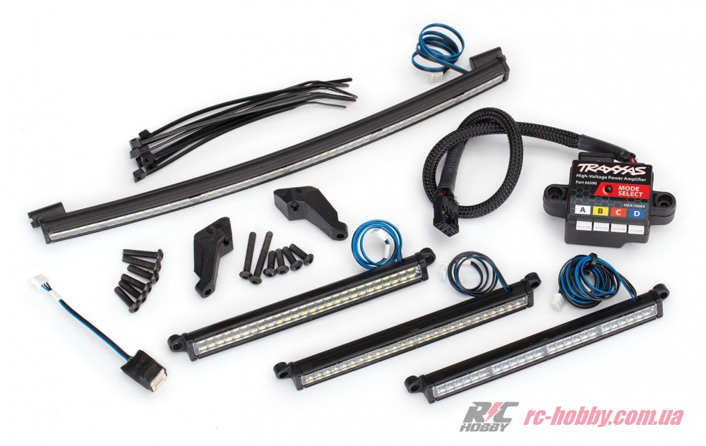 В комплекте два передних прожектора, задняя световая планка, изогнутый прожектор на крыше и высоковольтный усилитель мощности