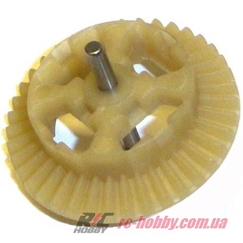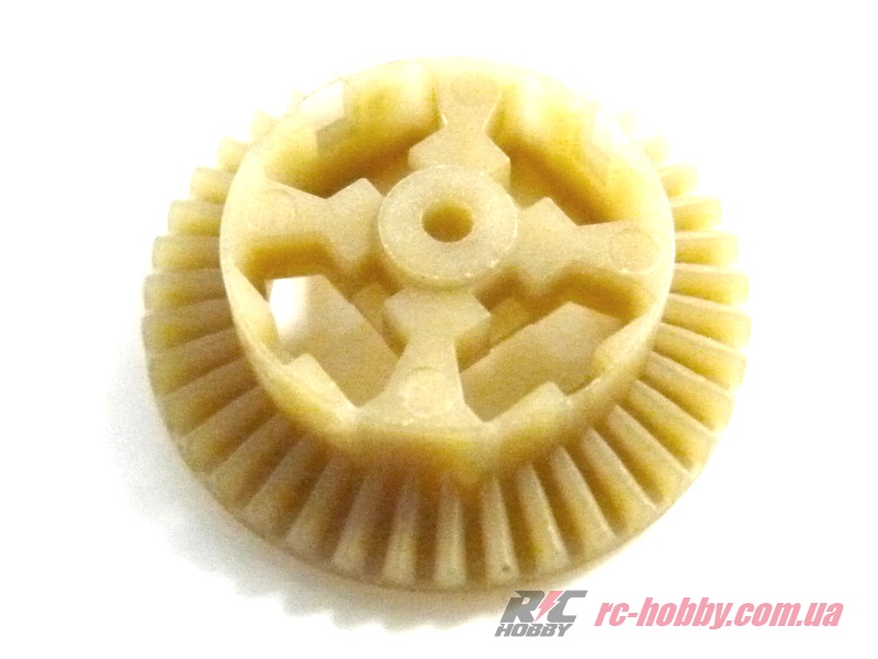 Коническая ведомая шестерня главной пары дифференциала для машинок на радиоуправлении Himoto. В комплекте одна пластиковая шестерня и одна металлическая шпилька.
