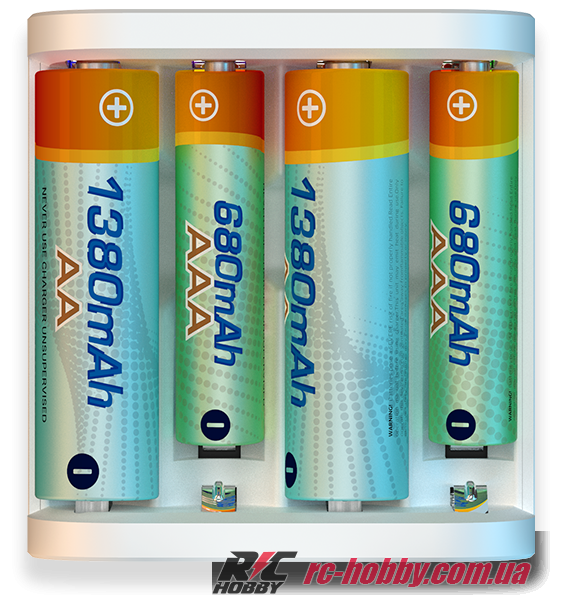 Заряджає одночасно і незалежно одразу чотири циліндричні АКБ.
