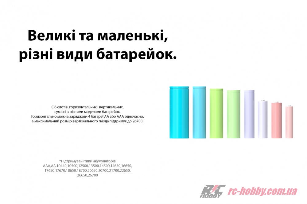 Зарядний бокс пристрою розраховано на 4 елементи типу ААА або АА, які можна підзаряджати одночасно або 2 більших елементи.