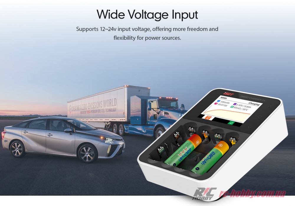 Зарядний пристрій ISDT C4 підтримує вхідну напругу в діапазоні 12-24В, забезпечуючи свободу вибору джерел живлення.