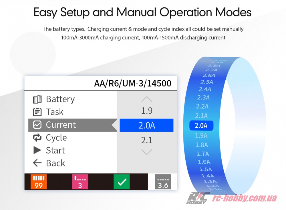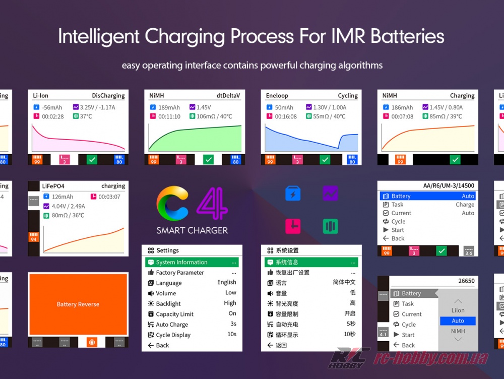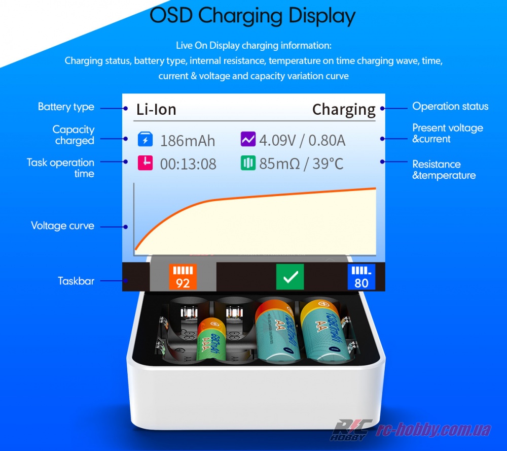 «Charging» (зарядка). Основна функція. Прилад заряджає акумулятори розмірів AAA, AA, 10440, 10500, 12500, 12650, 13500, 13650, 14500, 14650, 16650, 17650, 18650, 20650, 22650, 26650. Типи батарей, що підтримуються: NiMH, NiCd, NiZn, Eneloop, Li- Ion, LiHv, LiFePO4.