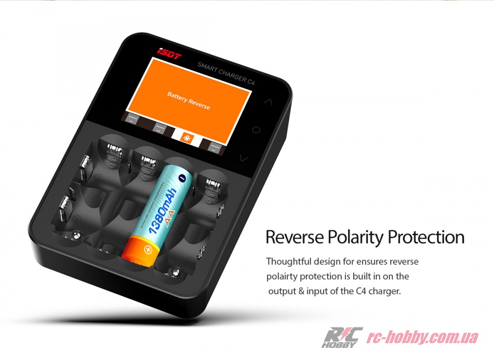 Зарядний пристрій ISDT C4 має захист від помилкового підключення акумулятора при зміні полюсів.