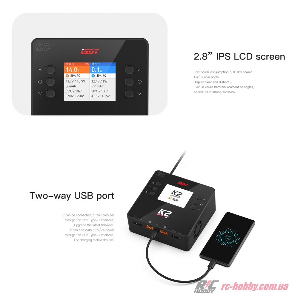 Двосторонній інтерфейс USB — це можливість оновлювати прошивку прямим під'єднанням шнура до ПК або ноутбука. А якщо сів смартфон, то ISDT K2 допоможе і цій проблемі: через USB Type-C пристрій виводить потужність 5В/2А, чого достатньо для мобільних ґаджетів.