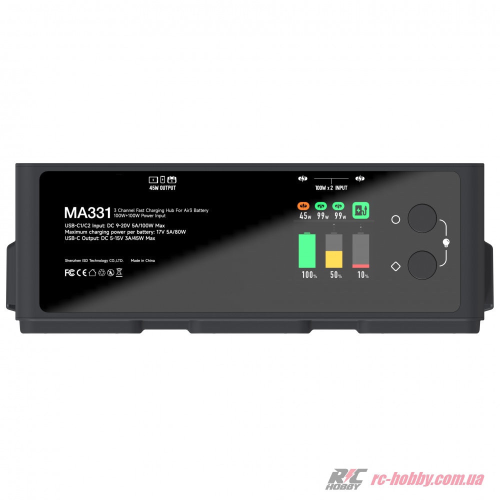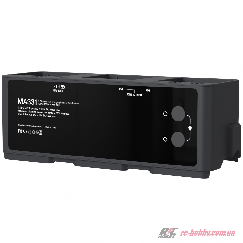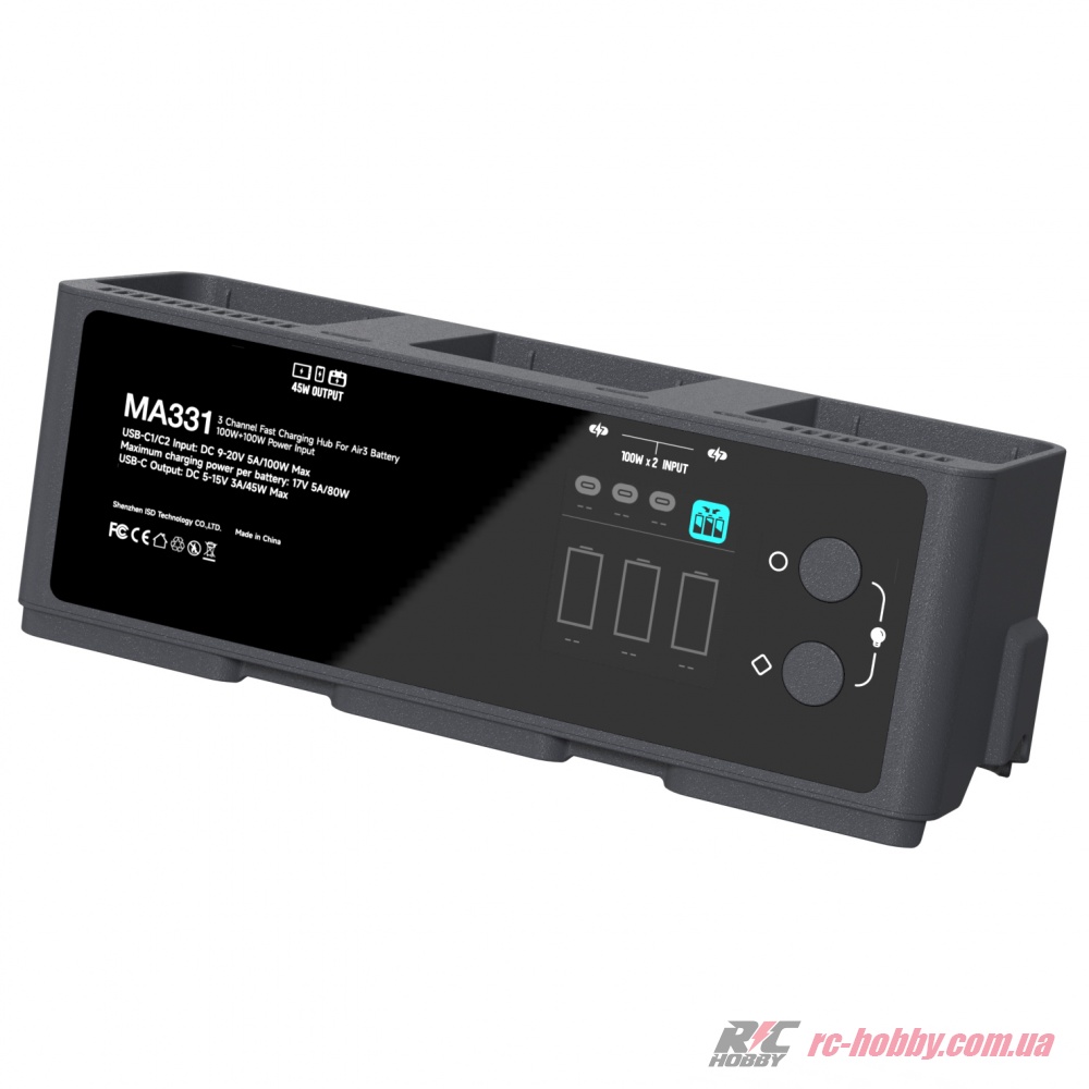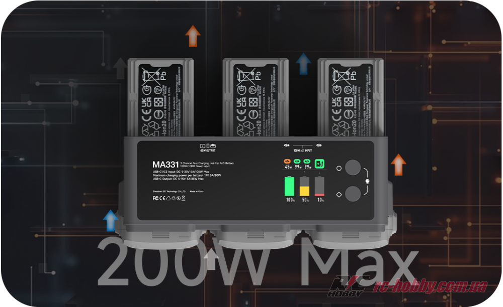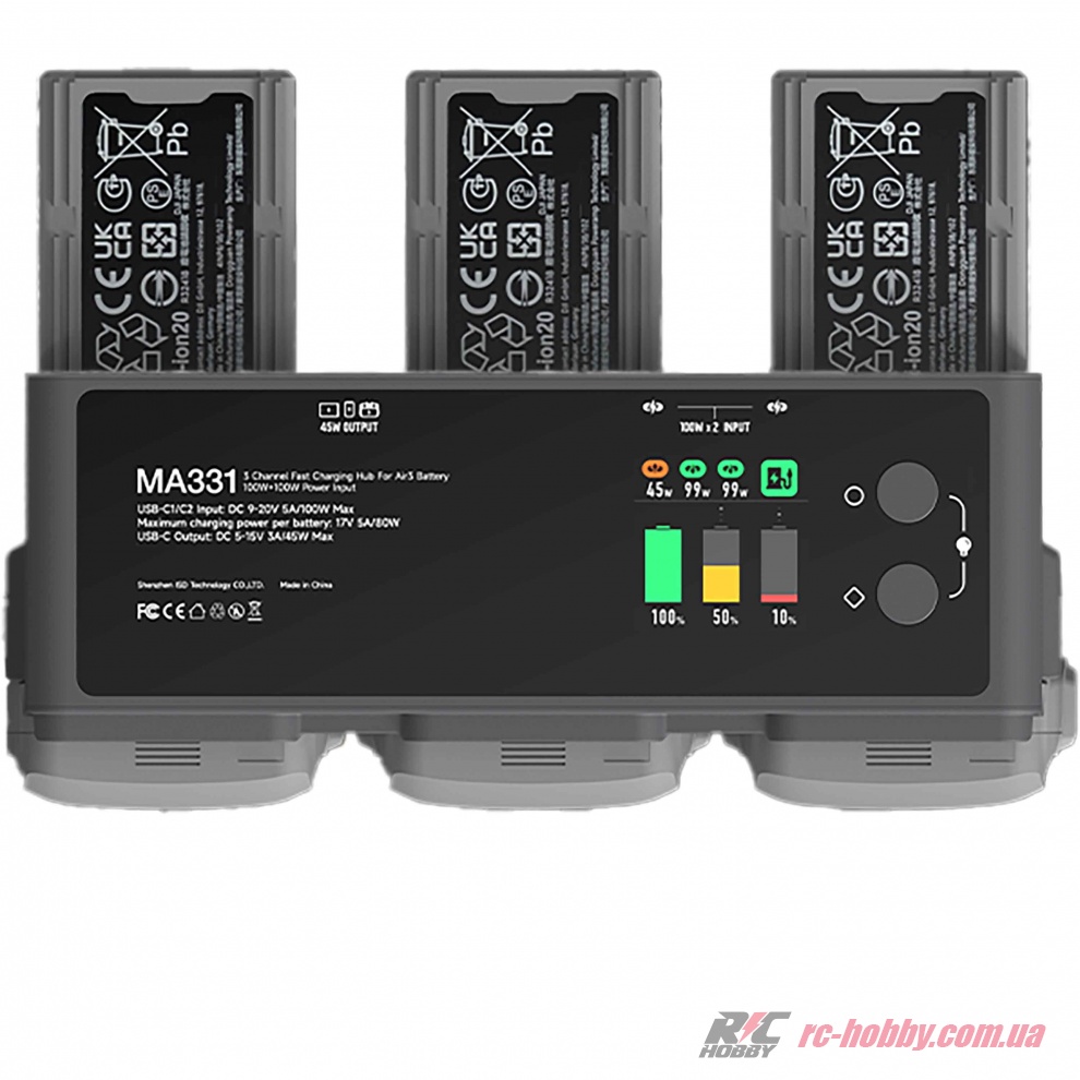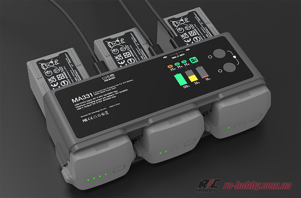 MA331 розганяє зарядку до максимуму: 80 Вт на один акумулятор або 180 Вт для трьох LiPO 4S (BWX233-4241-14.76) одночасно, заряджаючи їх за 50–70 хвилин у швидкому режимі (95%) або 60–90 хвилин до 100%.