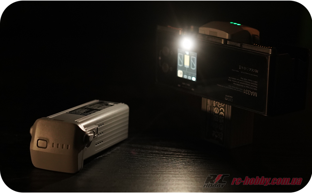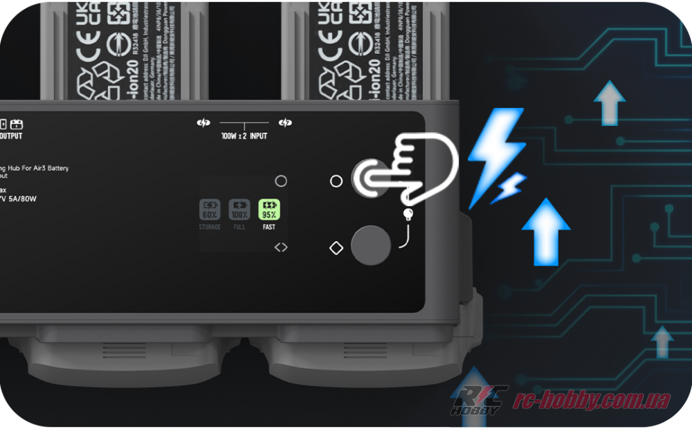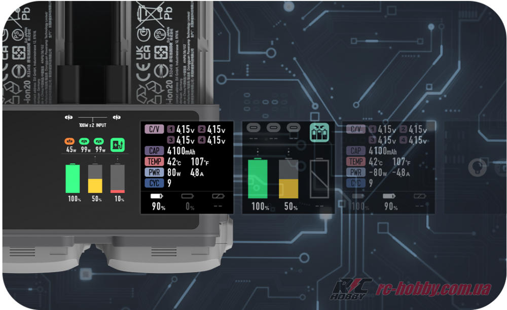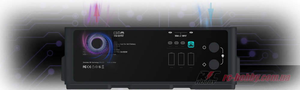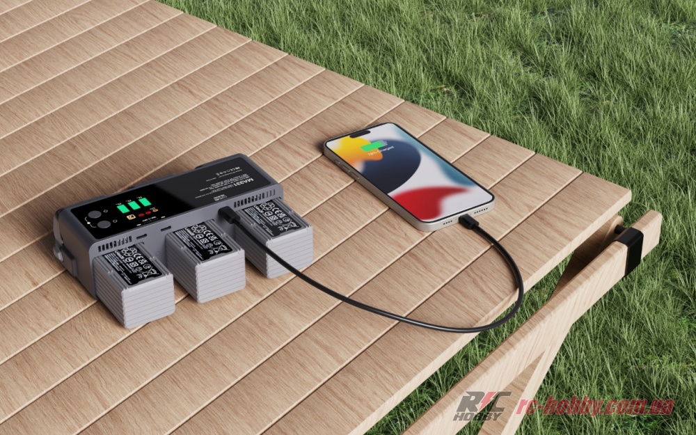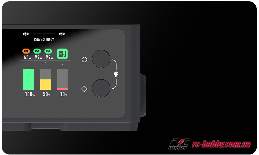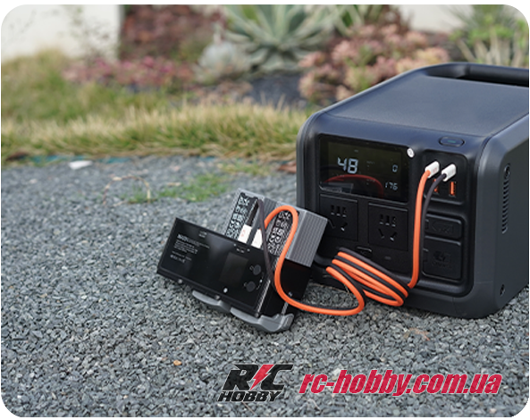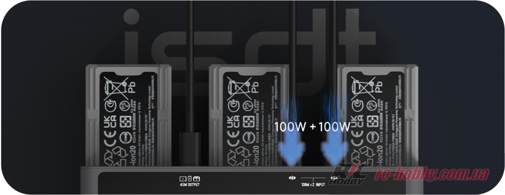 Два незалежні входи USB-C (9–20 В, до 5 А) дозволяють підключити адаптери до 100 Вт кожен для паралельної зарядки, минаючи повільний циклічний режим DJI.
