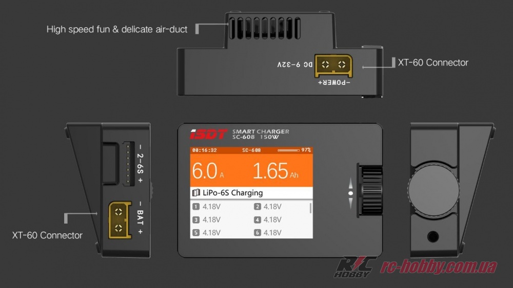 Зарядка нового поколения ISDT SC-608 придет на помощь в полевых условиях, ведь ее можно запитать через стандартный разъем XT60 как от блока питания, так и от другого аккумулятора.